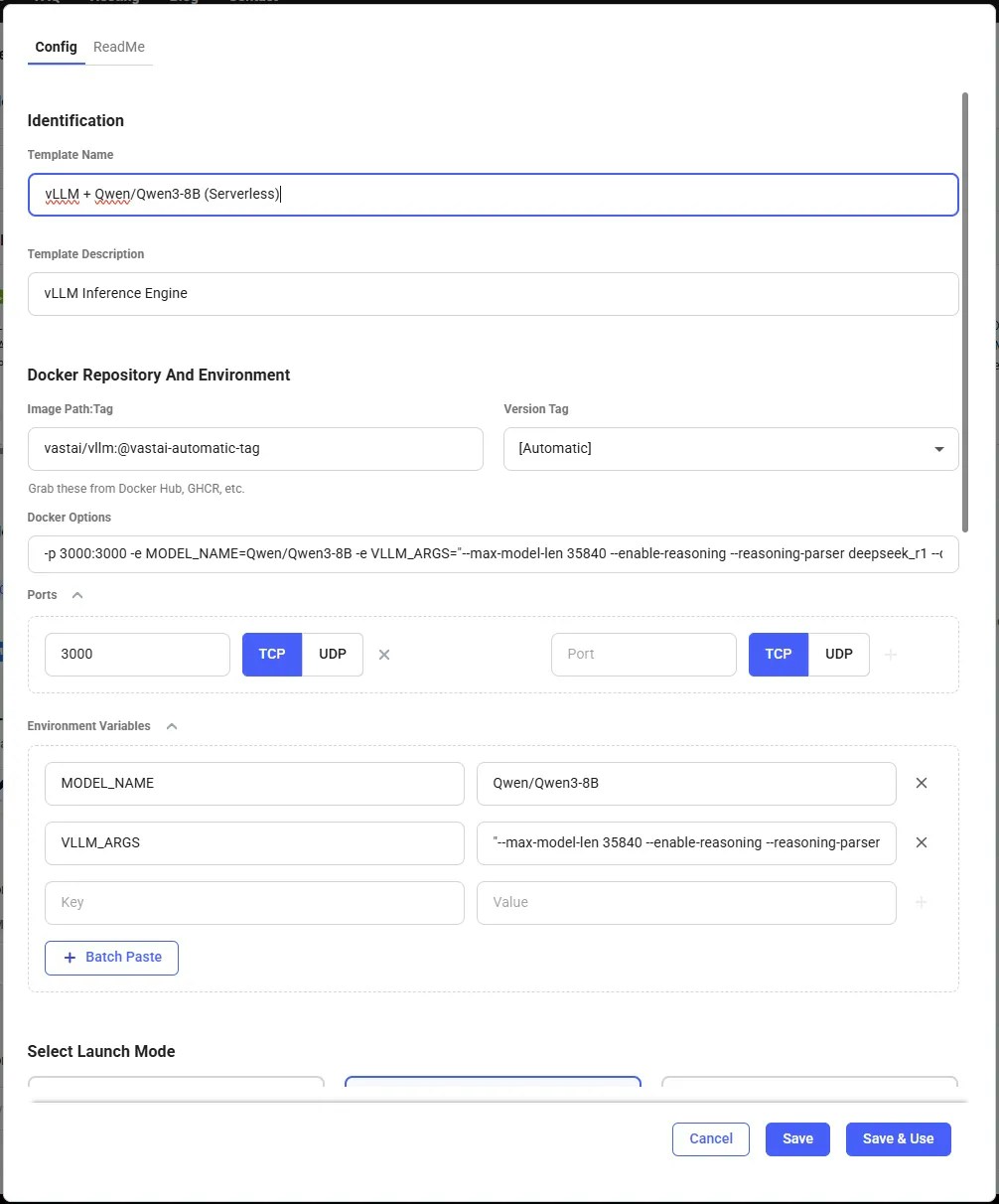 Vast.ai provides pre-made serverless templates (vLLM, ComfyUI) for popular use cases, and can be used with minimal setup effort. In this guide, we will setup a serverless engine to handle inference requests to a model using vLLM, namely Qwen3-8B , using the pre-made Vast.ai vLLM serverless template. This prebuilt template bundles vLLM with scaling logic so you don’t have to write custom orchestration code. By the end of this guide, you will be able to host the Qwen3-8B model with dynamic scaling to meet your demand.This guide assumes knowledge of the Vast CLI. An introduction for it can be found here.