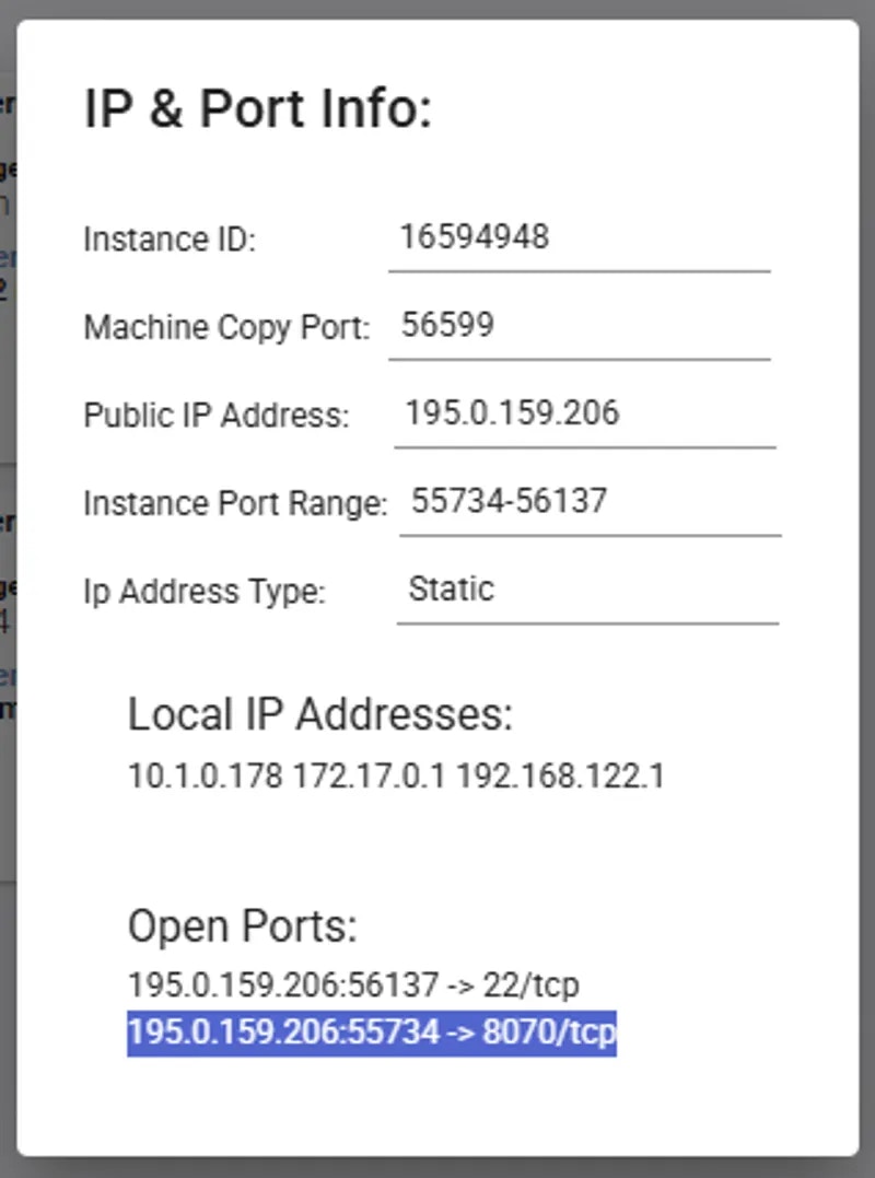 Note: Vast only allows -e and -p docker run options to set environment variables and expose ports.