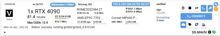 Once you have selected an instance offer, You’ll click on the INSTANCES link in the left menu and see your rented GPU instance that has your template applied. When the instance is done loading and the >_CONNECT state on the blue button appears, you should be able to see the ip range button at the top of the instance card. If you click the IP range button you will see a new modal has the IP and port information for your instance. You’ll see the port 8070 that we set listed in Open Ports. You can copy the machine IP and port and load the address (in this example: 195.0.159.206:55734) in a new browser tab or window. This address will load the GROBID web app.